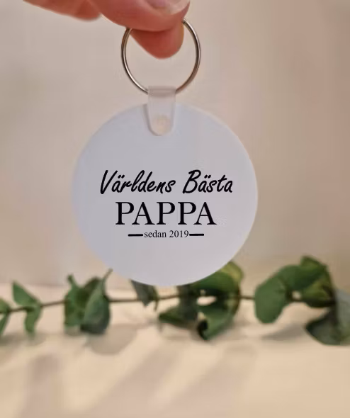 Här kan du beställa en personliga nyckelring med foto på ena sidan och texten Världens Bästa pappa eller Bonuspappa Sedan valfritt år på andra sidan.
