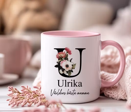 Visa din uppskattning till mamma, bonusmamma, mormor eller farmor på morsdag med vår fina mugg med en stor bokstav med en blomma ett valfritt namn och texten: Världens bästa mamma, bonusmamma, mormor eller farmor