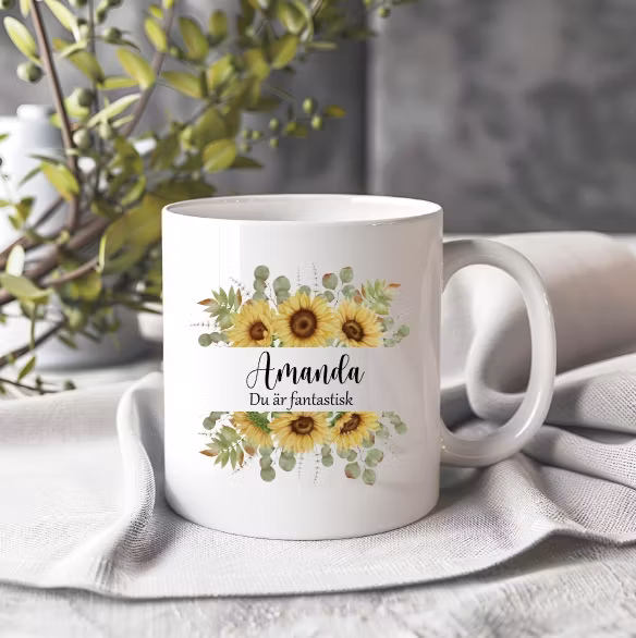 En personlig mugg med ett valfritt namn och en liten text som är i mellan de underbara solrosorna.