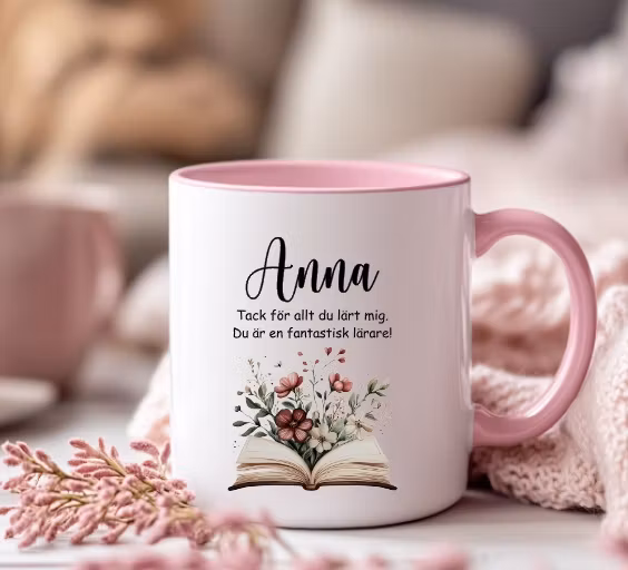 Visa din uppskattning till barnens lärare, fröken eller pedagog med denna fina mugg med en bok med växande blommor, ett valfritt namn och texten: