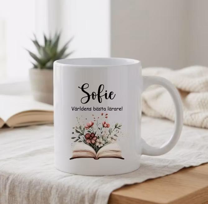 Visa din uppskattning till barnens lärare, fröken eller pedagog med denna fina mugg med en bok med växande blommor, ett valfritt namn och texten: