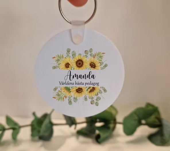 En fin nyckelring med solrosor, hens namn och en liten text Världens bästa pedagog , fröken, lärare...
