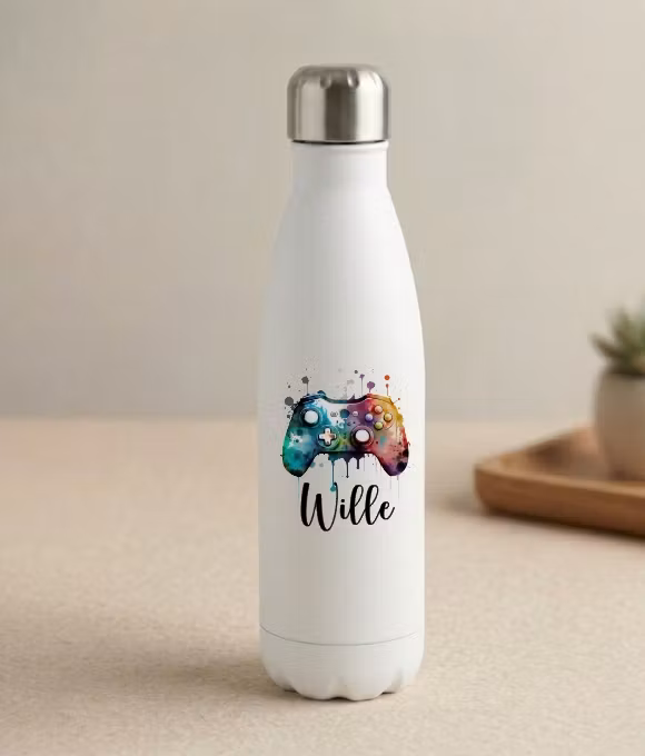 En häftig personlig termos i rostfritt stål med motivet spelkonsols och ett valfritt namn/efternamn.