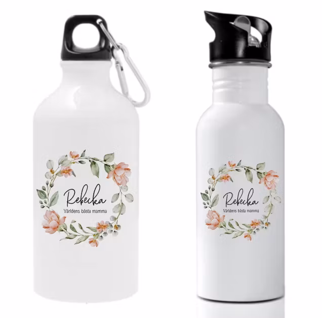 Fin personlig vattenflaska med en aprikos blomkrans med valfritt namn i.